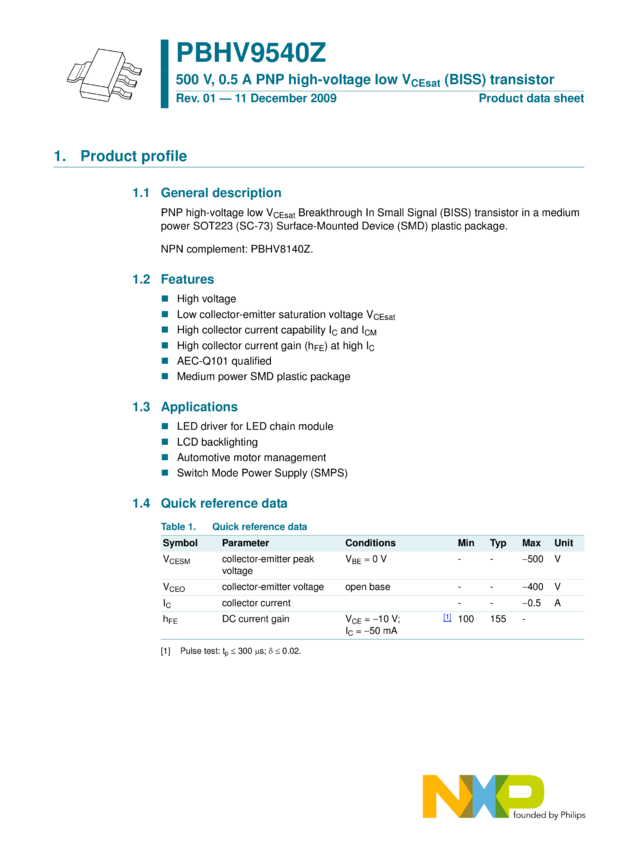 PBHV9540Z 500 V, 0.5 A PNP high-voltage low V_CEsat (BISS) transistor
