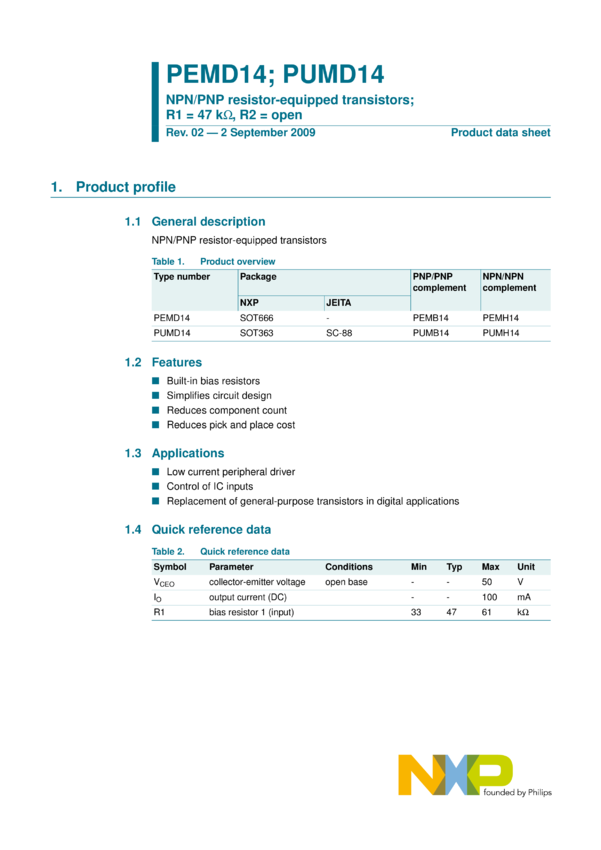 PEMD14 NPN/PNP resistor-equipped transistors; R1 = 47 kOhm, R2 = open
