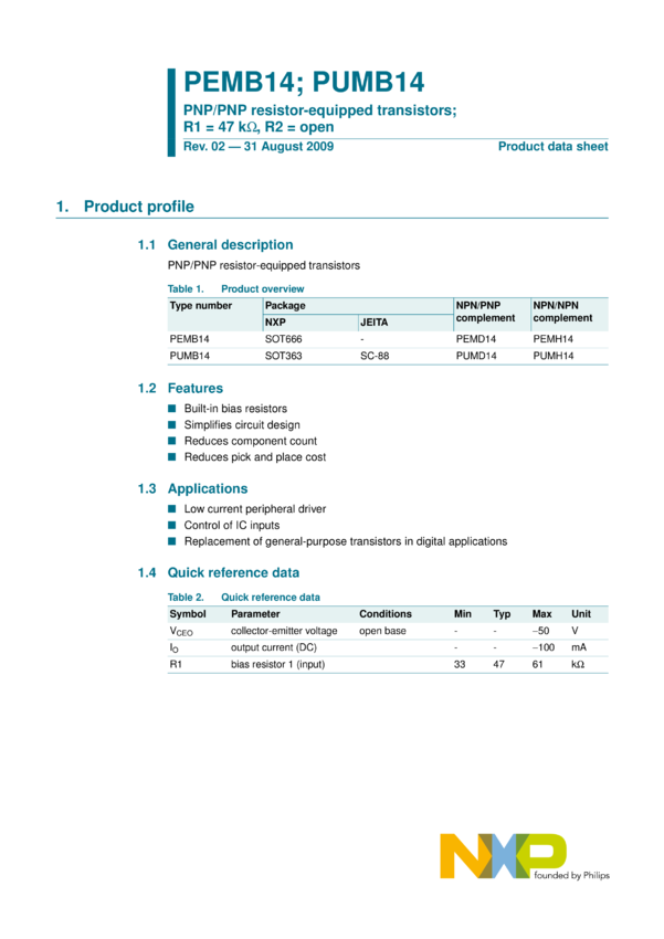 PEMB14 PNP/PNP resistor-equipped transistors; R1 = 47 kOhm, R2 = open