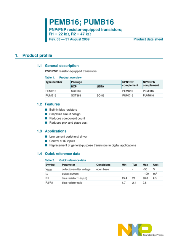 PEMB16 PNP/PNP resistor-equipped transistors; R1 = 22 kOhm, R2 = 47 kOhm