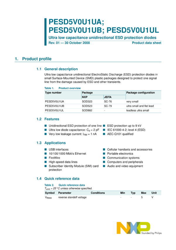 PESD5V0U1UA Ultra low capacitance unidirectional ESD protection diodes
