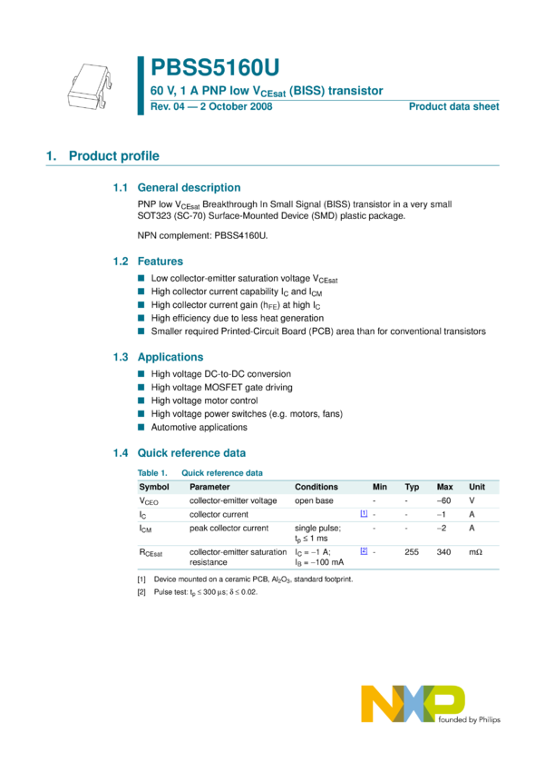 PBSS5160U 60 V, 1 A PNP low VCEsat (BISS) transistor