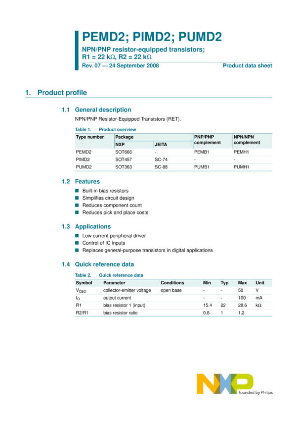 PEMD2 NPN/PNP resistor-equipped transistors; R1 = 22 kOhm, R2 = 22 kOhm