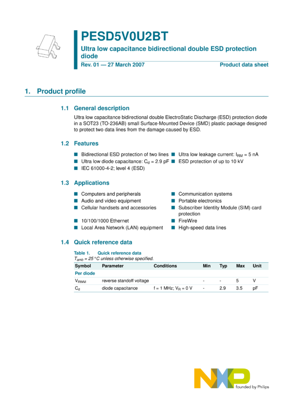 PESD5V0U2BT Ultra low capacitance bidirectional double ESD protection diode