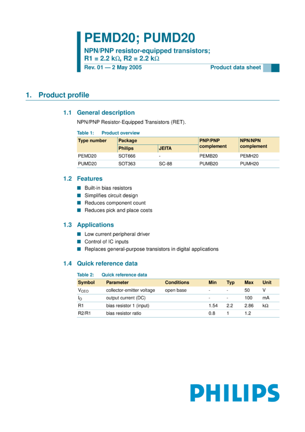 PEMD20 NPN/PNP resistor-equipped transistors; R1 = 2.2 kOhm, R2 = 2.2 kOhm