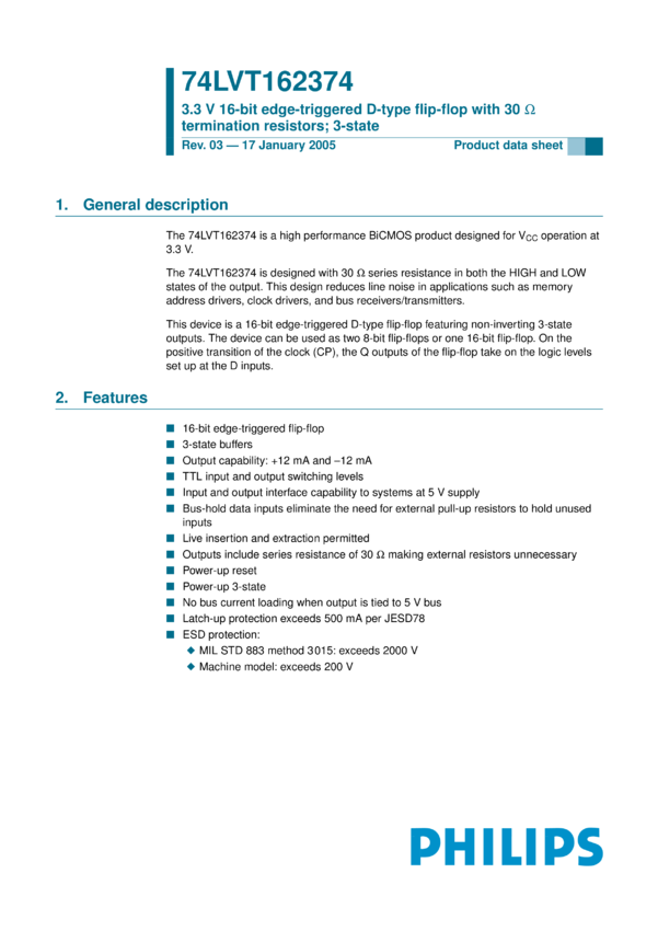74LVT162374 3.3 V 16-bit edge-triggered D-type flip-flop with 30 Ohm termination resist...