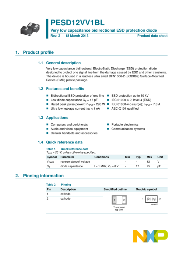 PESD12VV1BL Very low capacitance bidirectional ESD protection diode