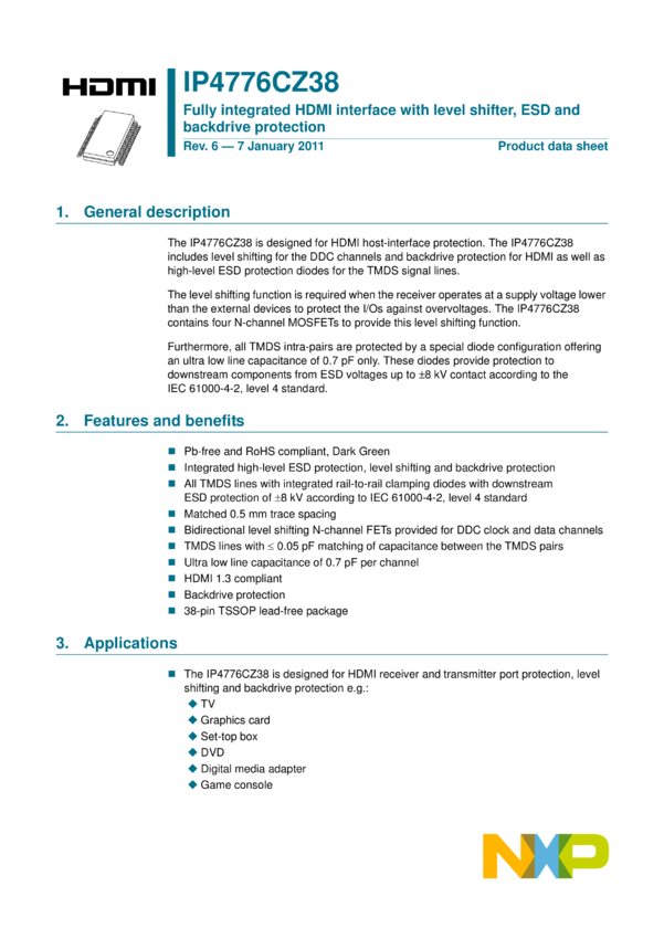 IP4776CZ38 Fully integrated HDMI interface with level shifter, ESD and backdrive prote...