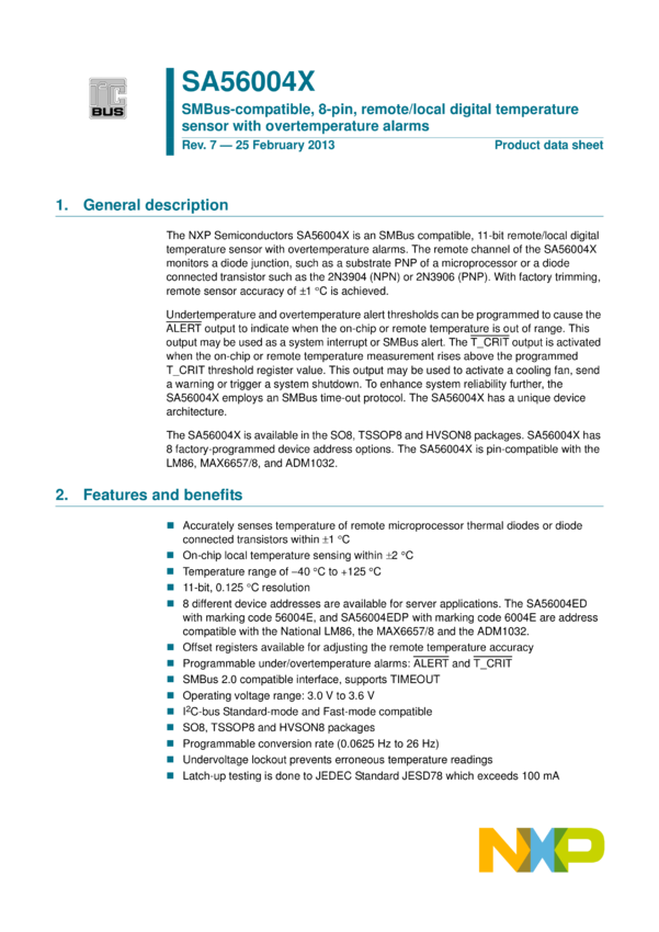 SA56004X SMBus-compatible, 8-pin, remote/local digital temperature sensor with overt...