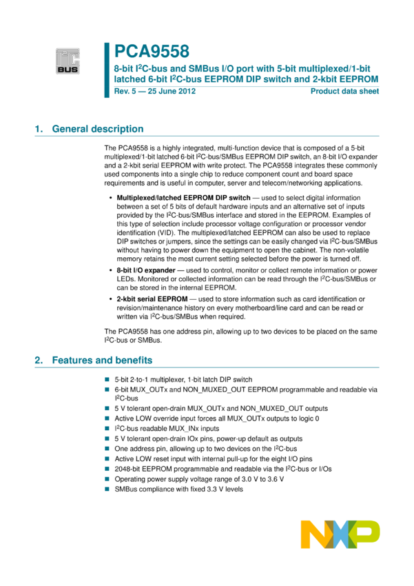 PCA9558 8-bit I2C-bus and SMBus I/O port with 5-bit multiplexed/1-bit latched 6-bit...