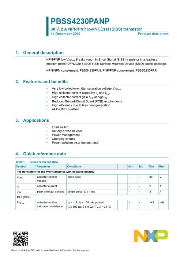 PBSS4230PANP 30 V, 2 A NPN/PNP low VCEsat (BISS) transistor