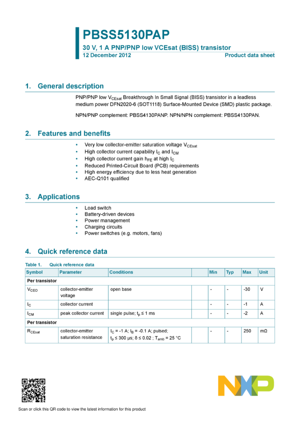 PBSS5130PAP 30 V, 1 A PNP/PNP low VCEsat (BISS) transistor