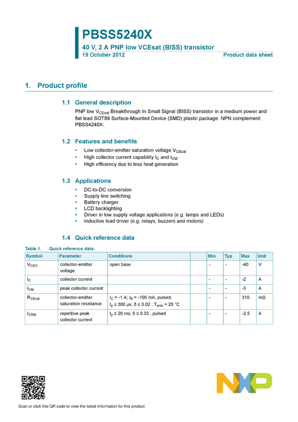 PBSS5240X 40 V, 2 A PNP low VCEsat (BISS) transistor