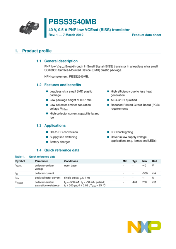 PBSS3540MB 40 V, 0.5 A PNP low VCEsat (BISS) transistor