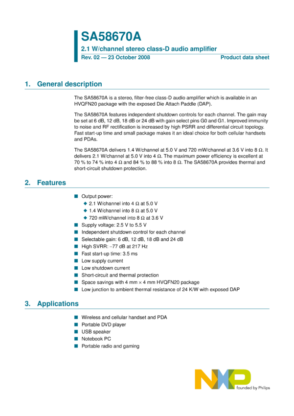 SA58670A 2.1 W/channel stereo class-D audio amplifier