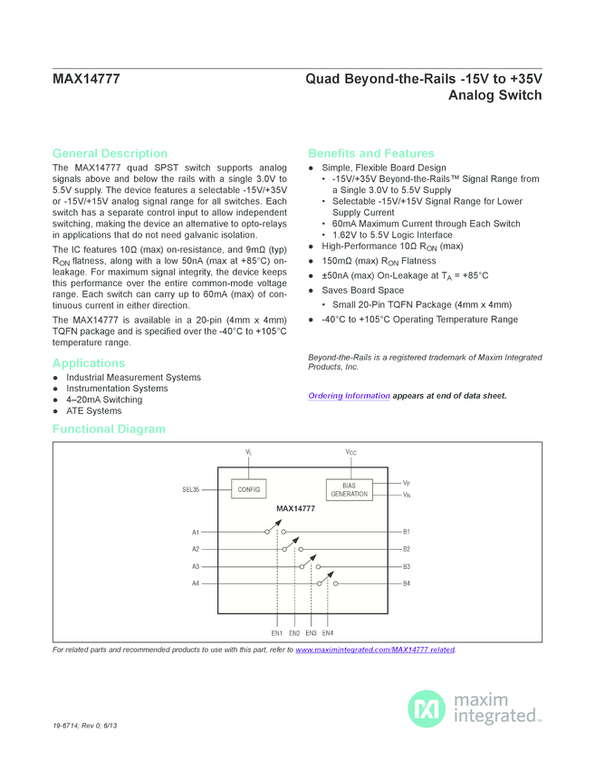 MAX14777 Quad Beyond-the-Rails -15V to +35V Analog Switch