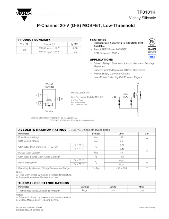 TP0101K 'P-Channel 20-V (D-S) MOSFET, Low-Threshold'