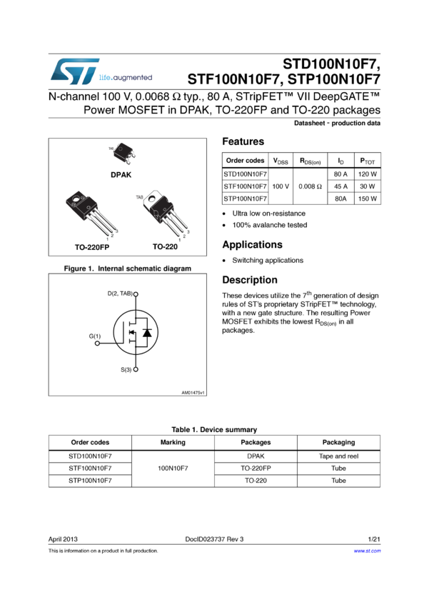 STD100N10F7 N-channel 100 V, 0.0068 Ohm typ., 80 A, STripFET(TM) VII DeepGATE Power MOS...