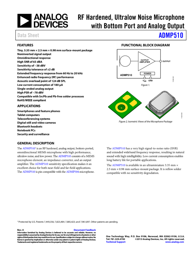 ADMP510: RF-Hardened Ultralow Noise Microphone with Bottom Port and Analog Output