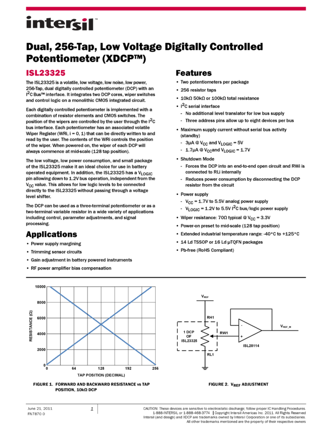 ISL23325 Dual, 256-Tap, Low Voltage Digitally Controlled Potentiometer (XDCP™)