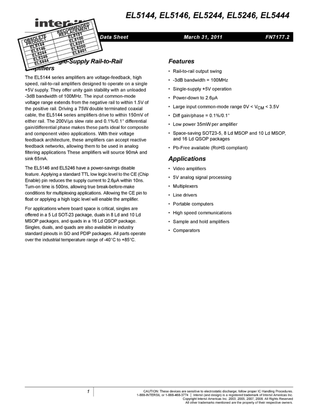 EL5246 100MHz Single-Supply Rail-to-Rail Amplifiers