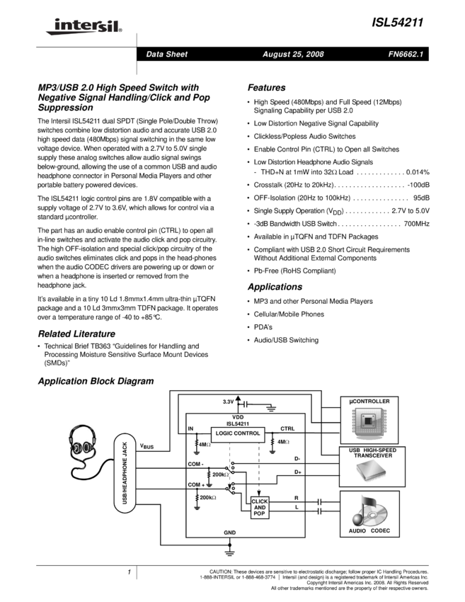 ISL54211 MP3/USB 2.0 High Speed Switch with Negative Signal Handling/Click and Pop S...