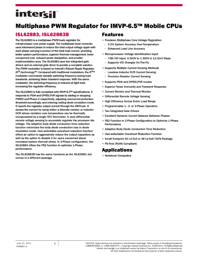 ISL62883B Multiphase PWM Regulator for IMVP-6.5™ Mobile CPUs