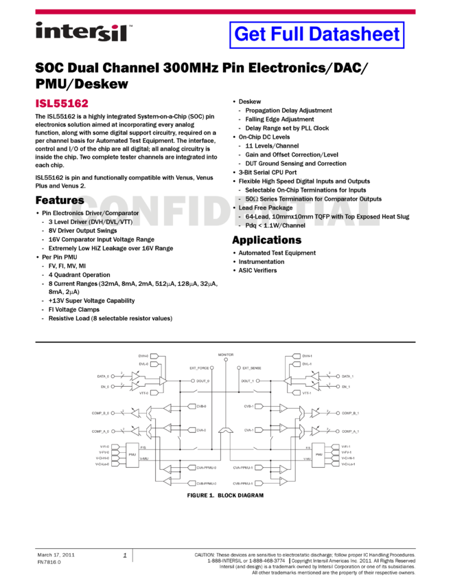 ISL55162 SOC Dual Channel 300MHz Pin Electronics/DAC/PMU/Deskew