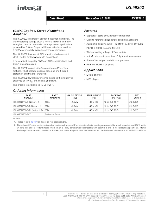 ISL99202 60mW, Capfree, Stereo Headphone Amplifier