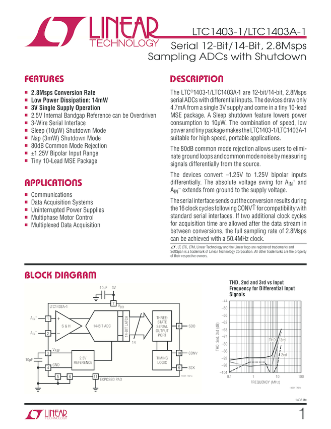 LTC1403-1 Serial 12-Bit, 2.8Msps Sampling ADCs with Shutdown