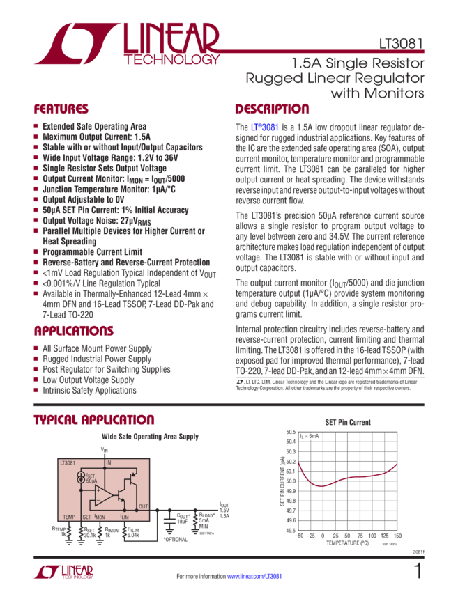 LT3081 1.5A Single Resistor Rugged Linear Regulator with Monitors