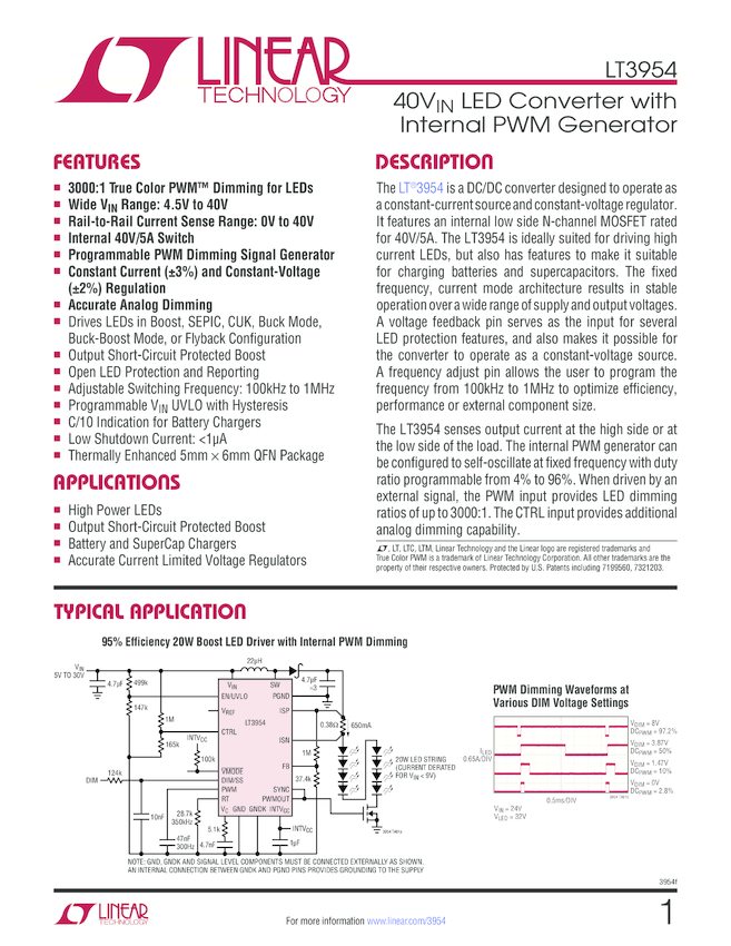 LT3954 40Vin LED Converter with Internal PWM Generator