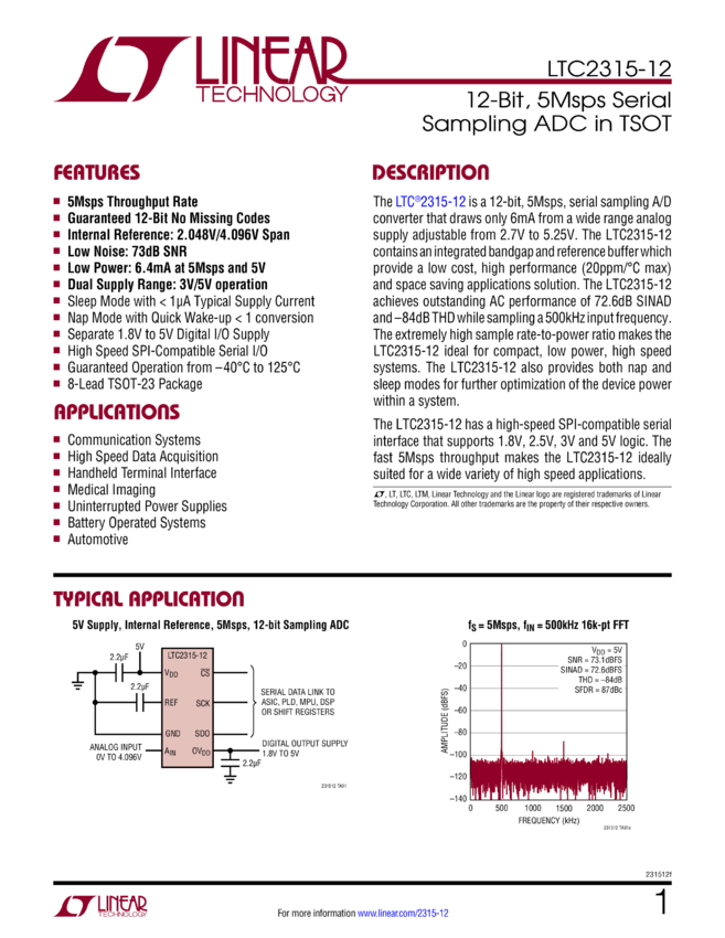 LTC2315-12 12-Bit, 5Msps Serial Sampling ADC in TSOT