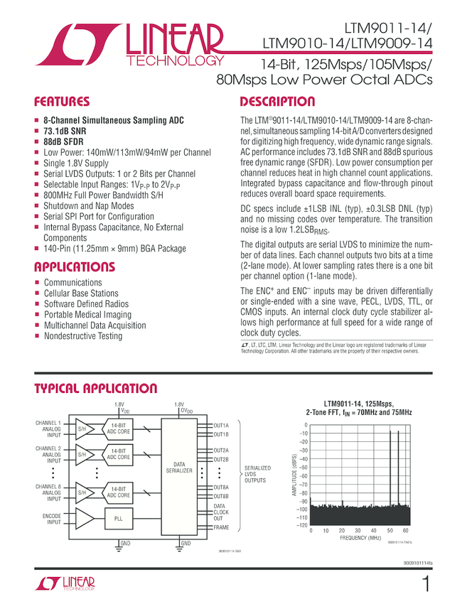 LTM9011-14 14-Bit, 125Msps Low Power Octal ADCs