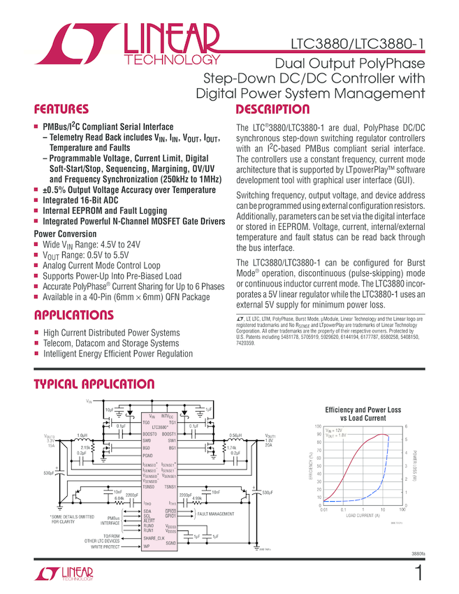 LTC3880 Dual Output PolyPhase Step-Down DC/DC Controller with Digital Power System...