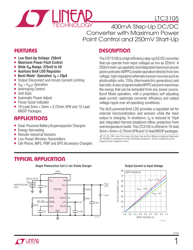 400mA Step-Up DC/DC Converter with Maximum Power Point Control and 250mV Start-Up