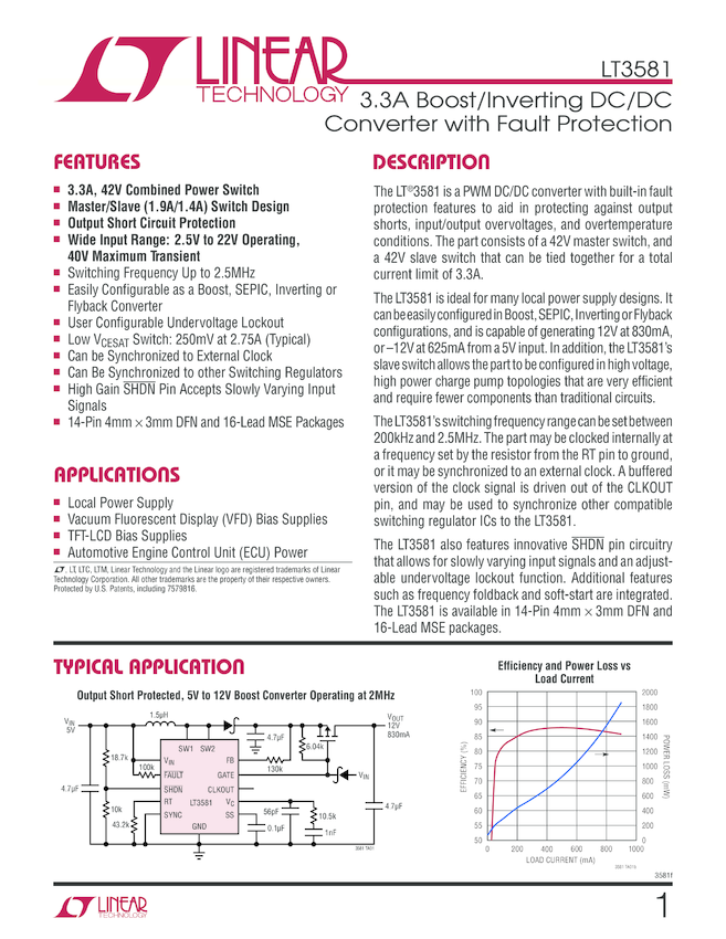 LT3581 3.3A Boost/Inverting DC/DC Converter with Fault Protection