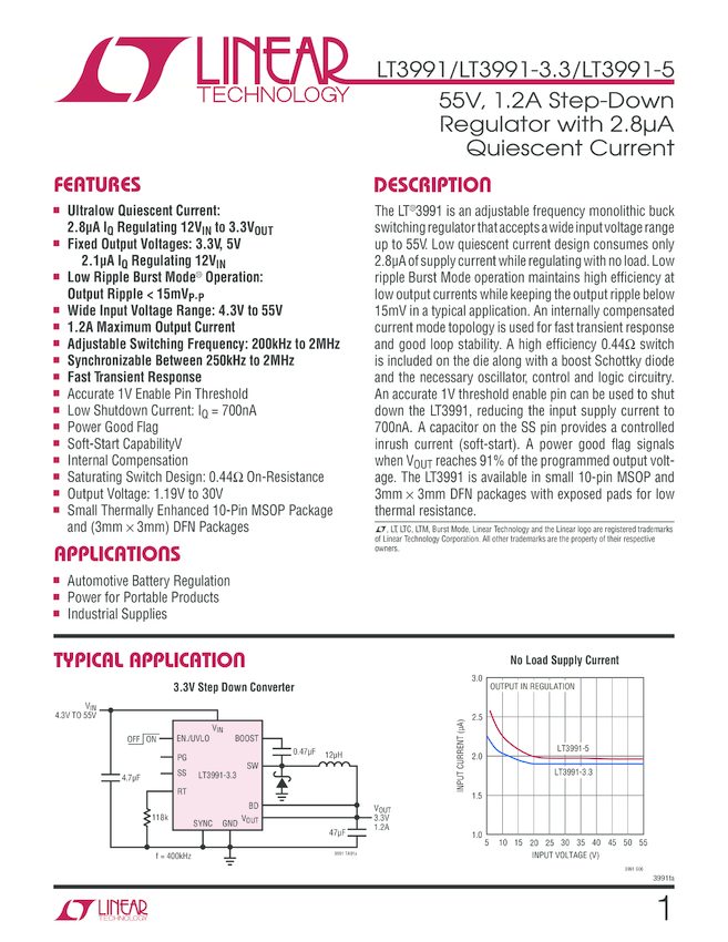 LT3991 55V, 1.2A Step-Down Regulator with 2.8μA Quiescent Current
