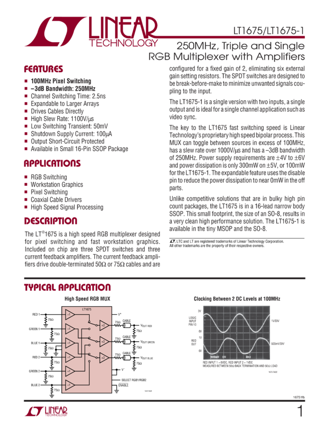 LT1675 250MHz, Triple and Single RGB Multiplexer with Amplifiers