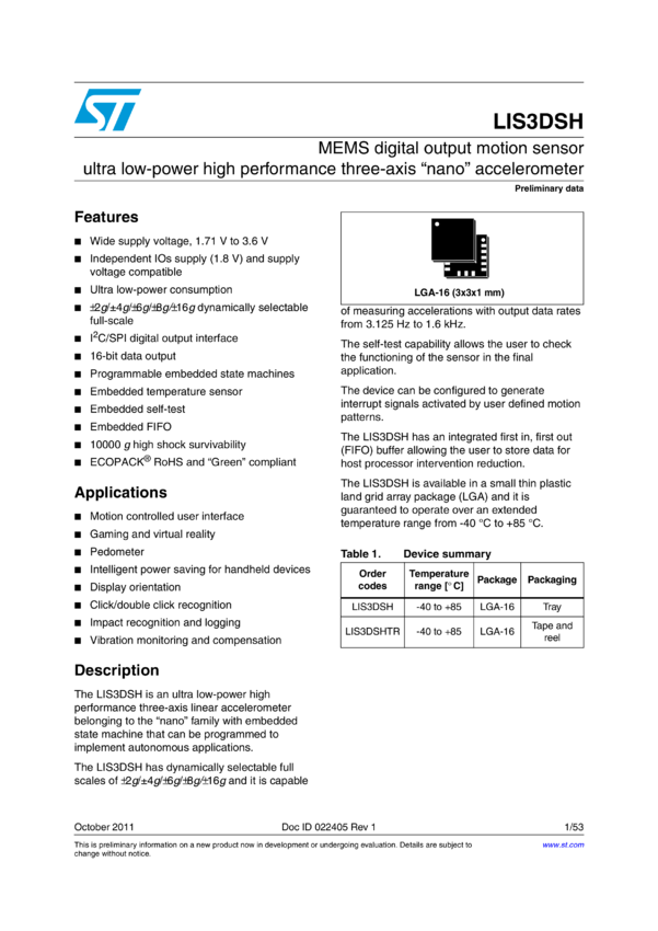 LIS3DSH MEMS digital output motion sensor: ultra low-power high performance 3-axes...