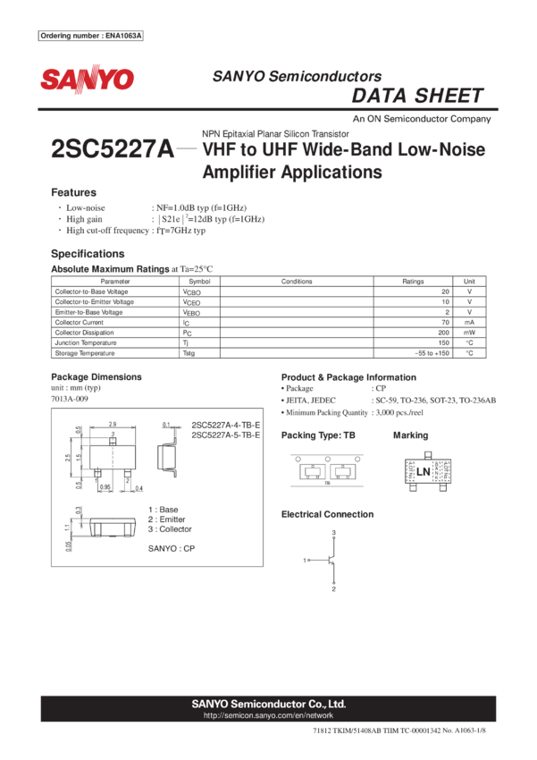 2SC5227A RF Transistor 10V 70mA fT;7GHz NPN Single CP