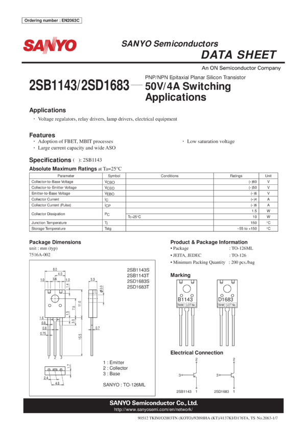 2SB1143 Bip Transistor -50V -4A VCE(sat);-700mV max. PNP Single TO-126ML