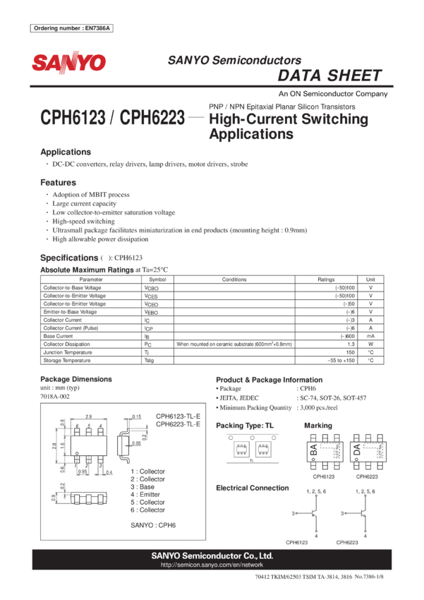 CPH6123 Single PNP Bipolar Transistor, -50 V, -3 A