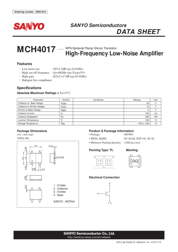 MCH4017 Single NPN RF Transistor, 12 V, 100 mA