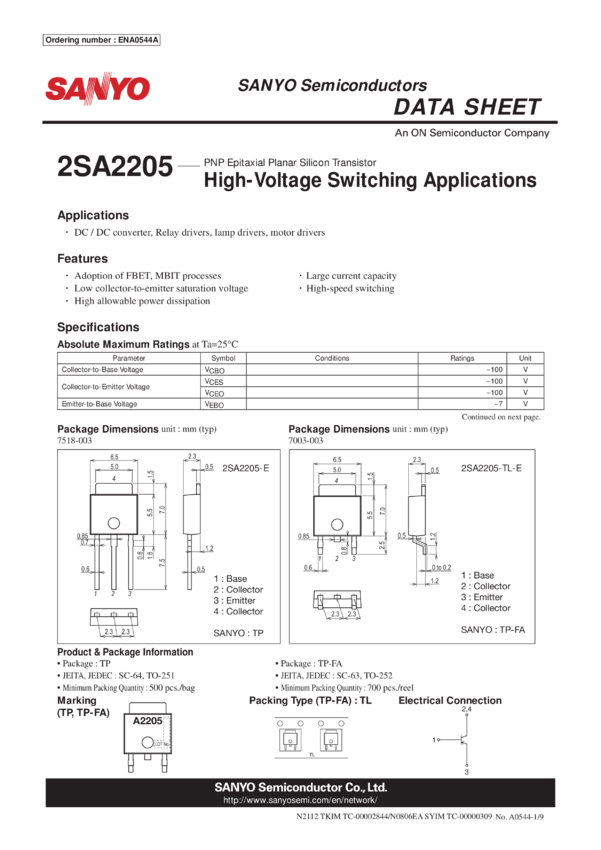 2SA2205 Bipolar Transistor -100V -2A VCE(sat);-240mV max. PNP Single TP/TP-FA