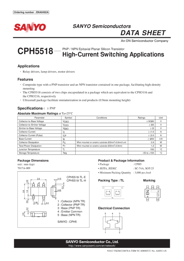 CPH5518 Bip Transistor (-)50V (-)1.0A VCE(sat);(-380)190mV max. PNP+NPN CPH5