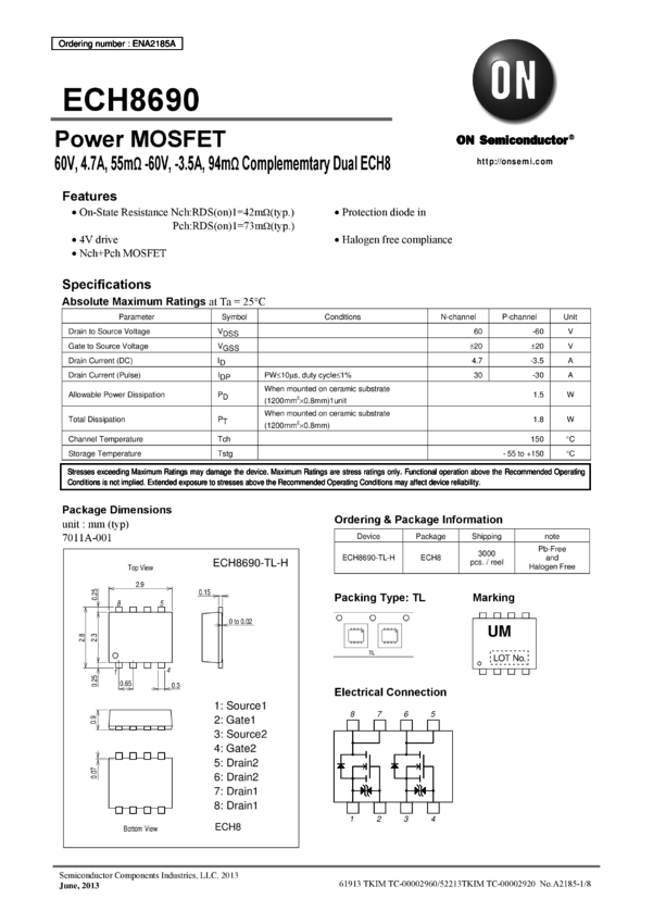 ECH8690 Power MOSFET 60V 4.7A 55 mOhm Complementary ECH8