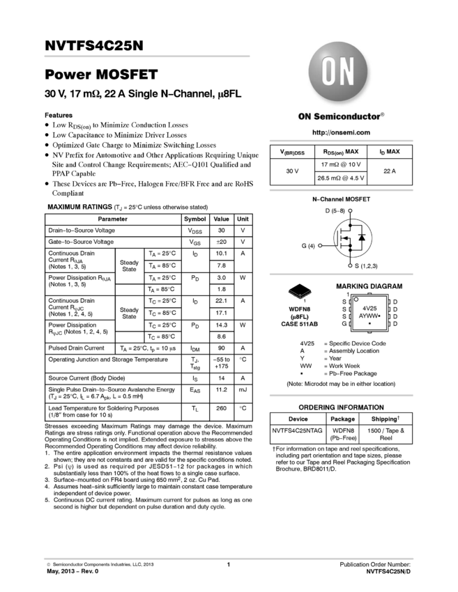 NVTFS4C25N Power MOSFET 30V 22A 17 mOhm Single N-Channel u8FL