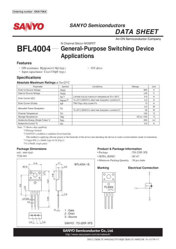 BFL4004 Power MOSFET 800V 6.5A 2.5 Ohm Single N-Channel TO-220F-3FS