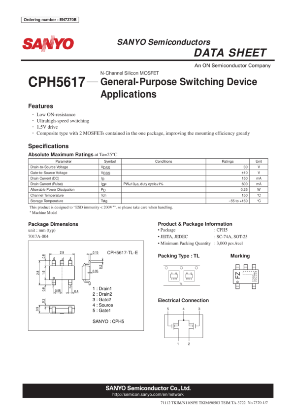 CPH5617 Small Signal MOSFET 30V 150mA 3.7 Ohm Dual N-Channel CPH5
